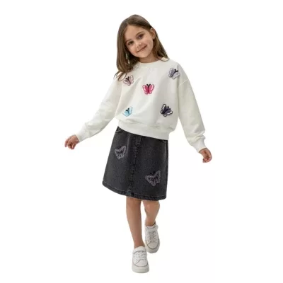 Kız Çocuk Kelebek Nakışlı Sweatshirt ve Kot Etek Takım (3-7 Yaş)