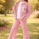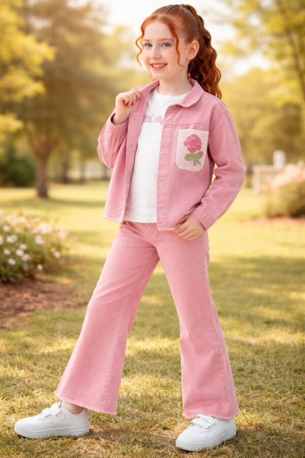 Kız Çocukpembe renk- çiçek nakışlı cep -önden çıtçıt kapamalı-kot ceket-kısa kollu-with my soul yazılı -beyaz renk tişörtlü- pembe renk -paça uçları püsküllü kot pantolonlu 3lü tk.
