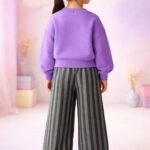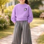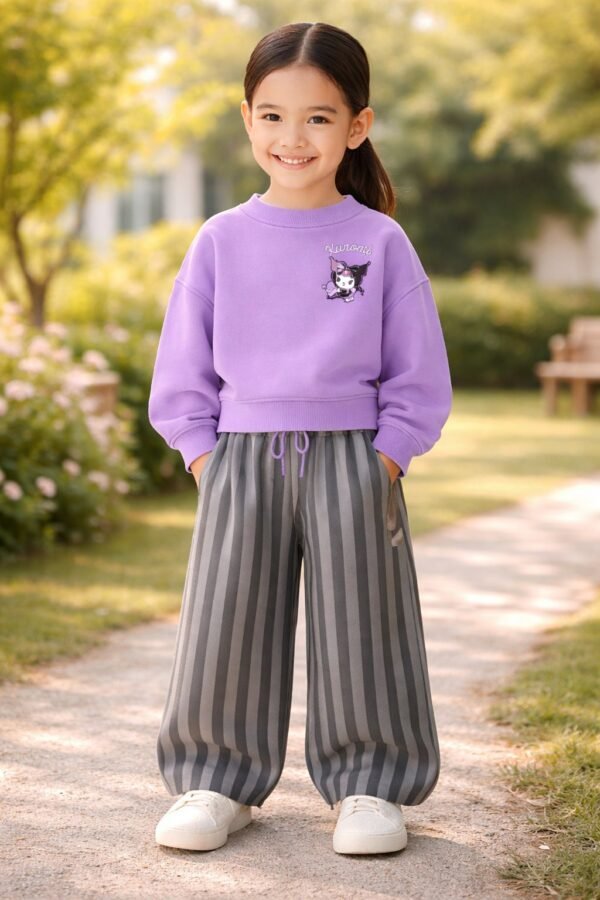 Parça Sayısı: 2 Parça (1 adet Kuromi nakışlı sweatshirt ve 1 adet dikey çizgili geniş paça pantolon).