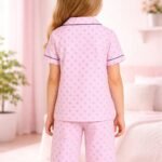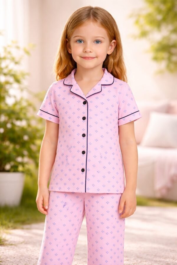 Kız Çocuk Önden Düğmeli Kısa Kollu Çiçek Baskılı Pembe Renk Pijama Takımı