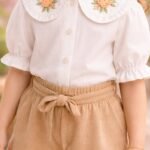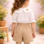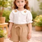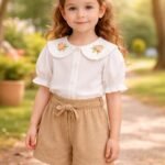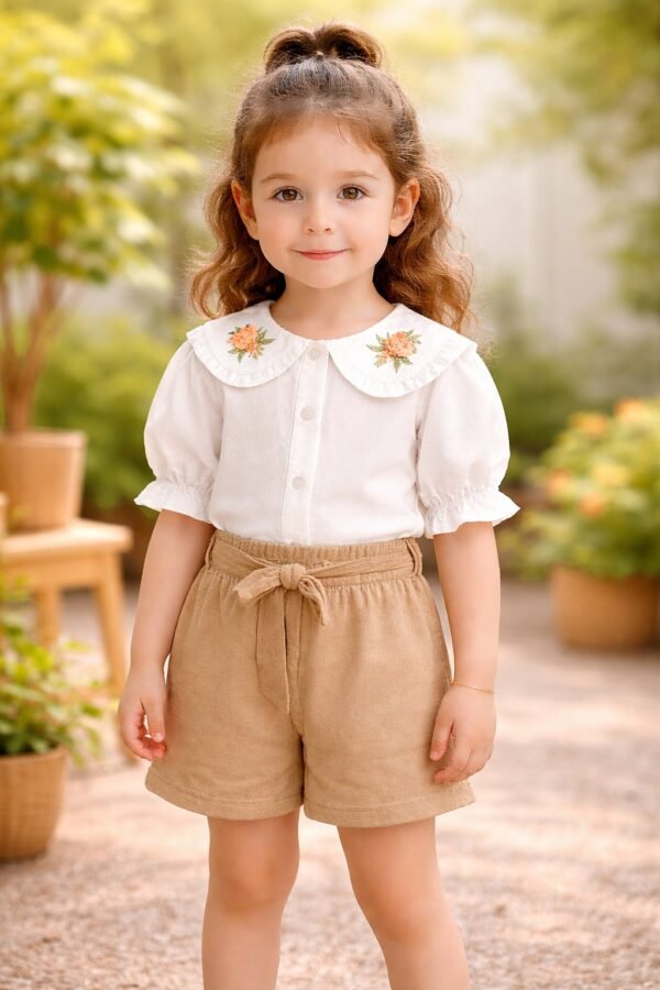 Kız Çocuk Önden Düğneli – Yaka Kısmı Çiçek Nakışlı – Kısa Kollu Gömlekli – Şortlu Takım