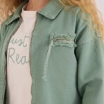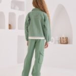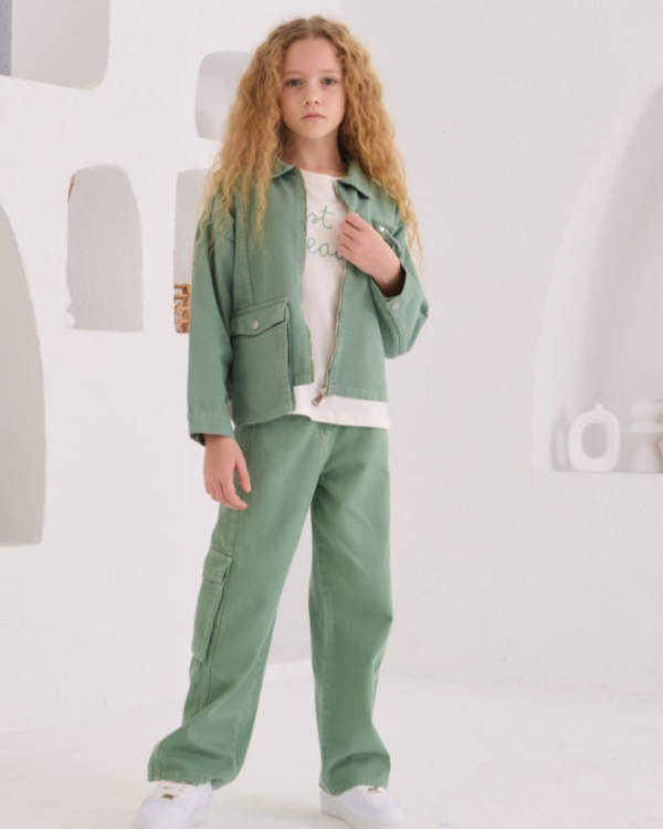 Kız çocuk önden fermuarlı_cep detaylı_ yeşil renk- ceket-kısakol tişörtlü- kargo cepli- keten kot kumaşlı kot takım