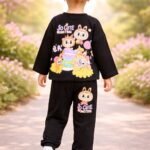 Üst parçada baskı göğüs bölümünü genişçe kaplarken, alt parçada sol bacak üzerinde üsttekiyle uyumlu küçük bir karakter figürü ve yazı detayı bulunur.