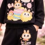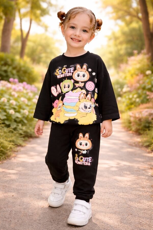 Kız Çocuk So Cute Monsters Yazılı Labubulu Siyah Renk Takım