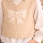 V yaka, incili ve fiyonk motifli yumuşak triko süveter.