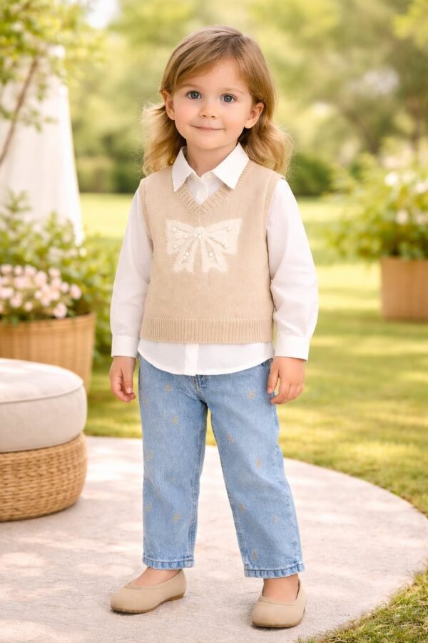 Kız Çocuk Taş İşlemeli Triko Süveter-gömlek-fiyonk Desenli Kot Pantolon Takım