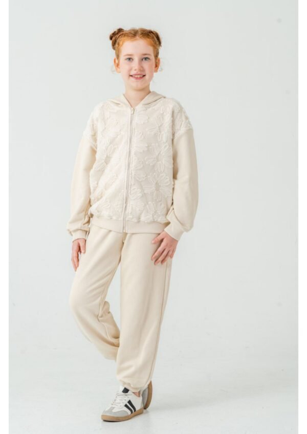 Çiçek Nakışlı Krem Kız Çocuk Fermuarlı Eşofman Takımı