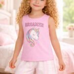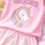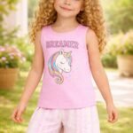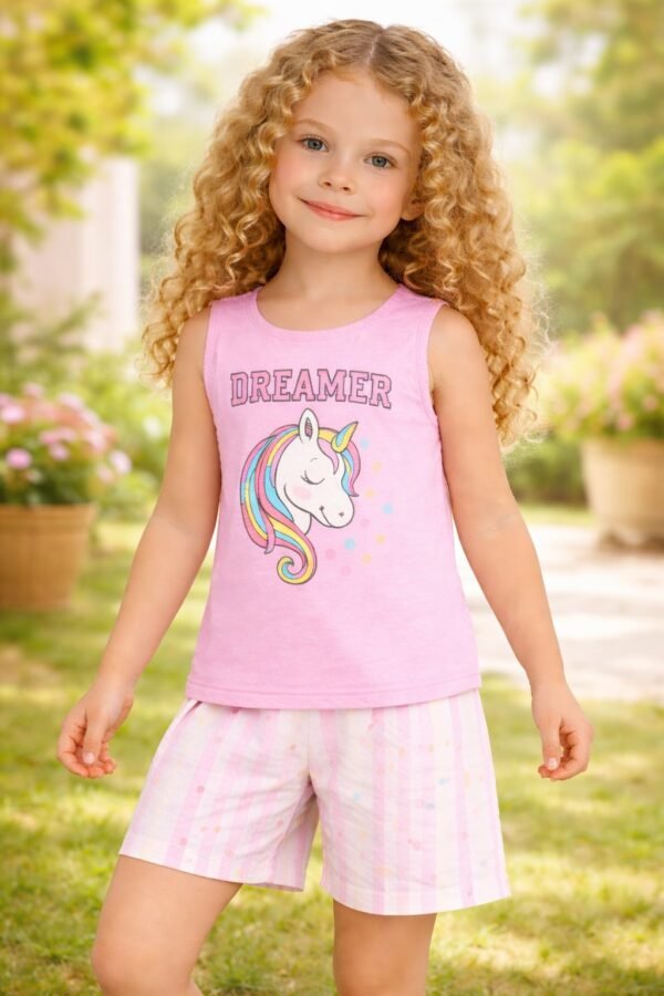 Kız Çocuk unicorn baskılı dreamer yazılı lısa kollu kaprili pijama takımı