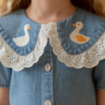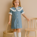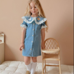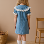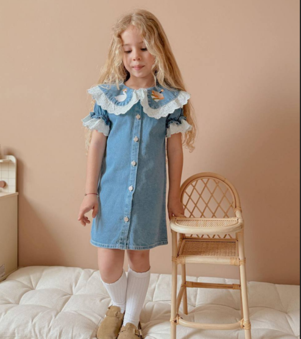 Kız Çocuk Yakası Ördek Nakışlı – Fistolu – Önden Düğmeli Kot Elbise