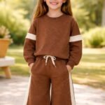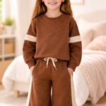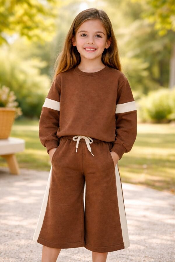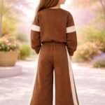 Kız Çocuk Yanı Şeritli Bol Paçalı Kahve Renk Eşofman Takım