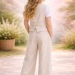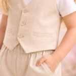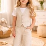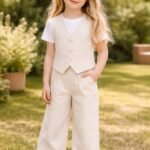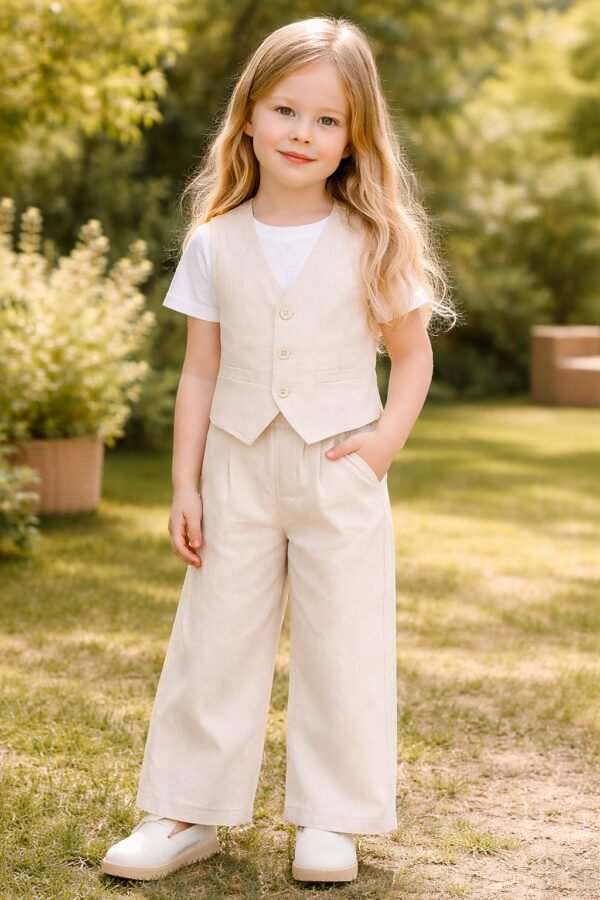 Kız Çocuk Yelekli – Kısa Kol Tişörtlü – Krem Renk – Pantolon Takım