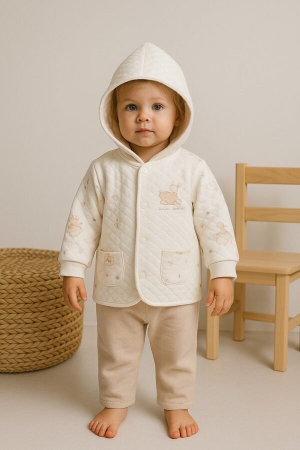 Unisex Önden Çıtçıt Kapamalı Yavru Ceylan Baskılı Cepli Pamuklu Kapşonlu Hırka nasıl bir kumaştan üretilmiştir?